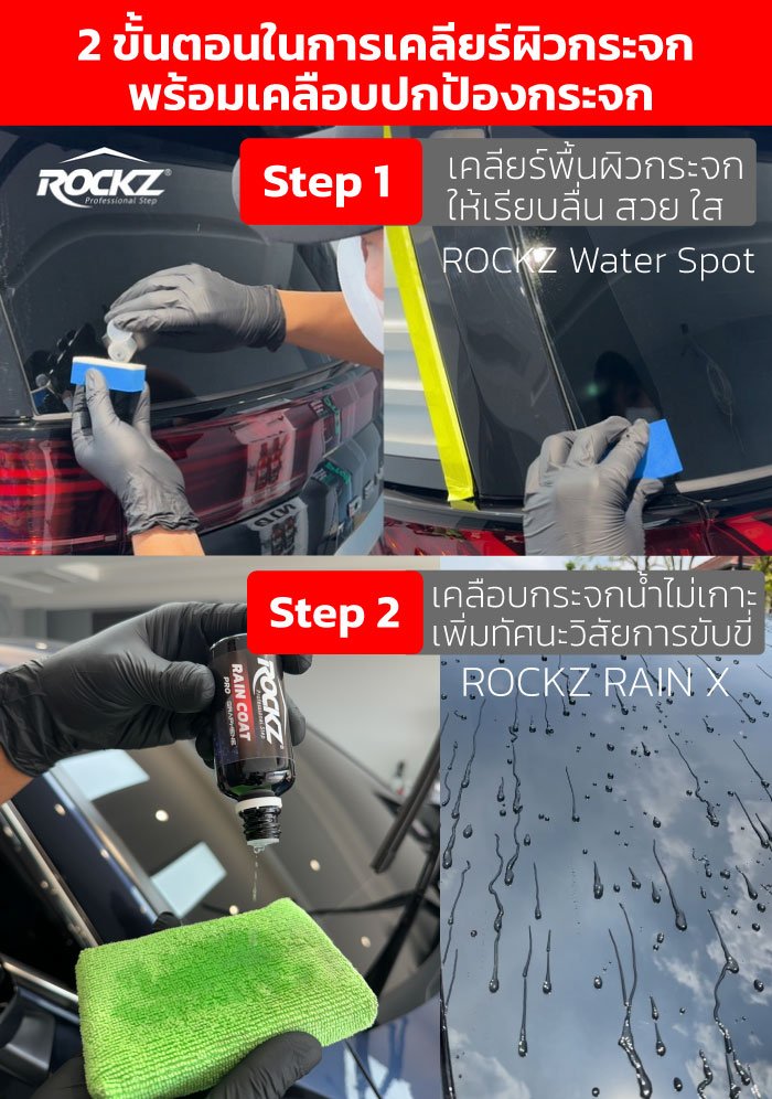 Step 1 เคลียร์พื้นผิวด้วย ROCKZ Water Spot หรือ 3D Erasergel ใช้ผ้าไมโครไฟเบอร์หรือฟองน้ำสำหรับขัดเฉพาะจุด หยด ROCKZ Water Spot ลงบนผ้า แล้วขัดเบาๆ เป็นวงกลมบริเวณที่มีคราบน้ำ น้ำยาจะช่วยละลายแร่ธาตุและกรดฝังแน่นที่เกาะบนผิวสีและกระจกออกอย่างปลอดภัย จากนั้นเช็ดออกด้วยผ้าไมโครไฟเบอร์สะอาด ใช้ได้ทั้งบนผิวสีรถและกระจก โดยไม่ทำลายชั้นเคลือบหรือผิวแลคเกอร์