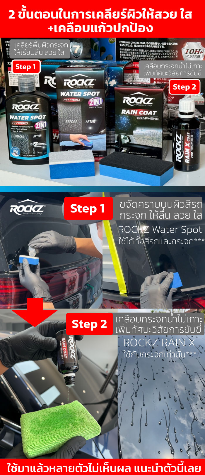 Step 1 เคลียร์พื้นผิวด้วย ROCKZ Water Spot หรือ 3D Erasergel ใช้ผ้าไมโครไฟเบอร์หรือฟองน้ำสำหรับขัดเฉพาะจุด หยด ROCKZ Water Spot ลงบนผ้า แล้วขัดเบาๆ เป็นวงกลมบริเวณที่มีคราบน้ำ น้ำยาจะช่วยละลายแร่ธาตุและกรดฝังแน่นที่เกาะบนผิวสีและกระจกออกอย่างปลอดภัย จากนั้นเช็ดออกด้วยผ้าไมโครไฟเบอร์สะอาด ใช้ได้ทั้งบนผิวสีรถและกระจก โดยไม่ทำลายชั้นเคลือบหรือผิวแลคเกอร์